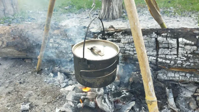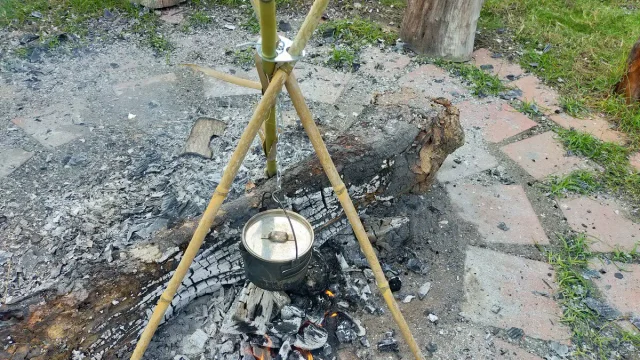 トライポッドと自在鉤があれば、焚き火の上にクッカーを吊るすことができます。
