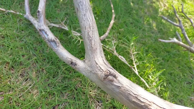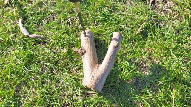 2股になった枝の先端から、1cmほど下の位置に電動ドリルで穴を空けましょう。