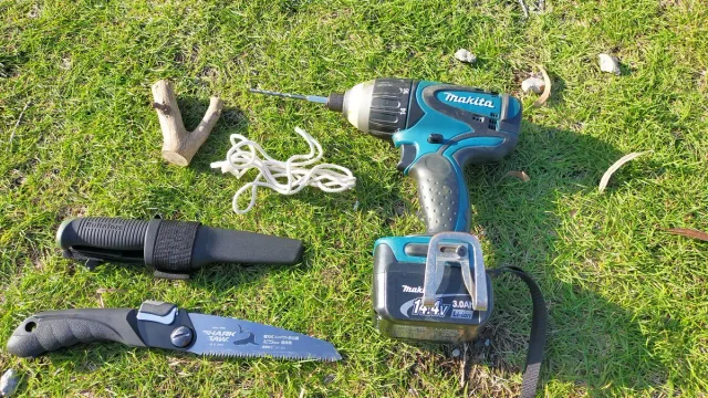 電動ドリル、ナイフ、のこぎりを使用した作業の際には、けがをしないように注意してくださいね。キャンプ場で木の枝を入手する際には必ずスタッフの許可を得てからにしましょう。