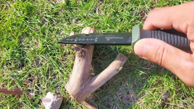 トライポッド金具の2.2cmの直径より太い枝や竹も、ナイフを使えば金具に差し込むことができます。枝や竹の先端をナイフで削って、穴に入るサイズに調整しましょう。