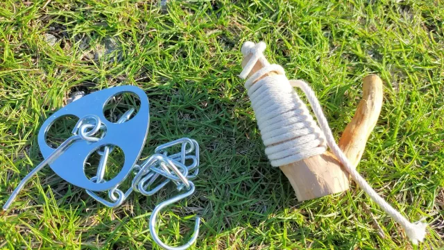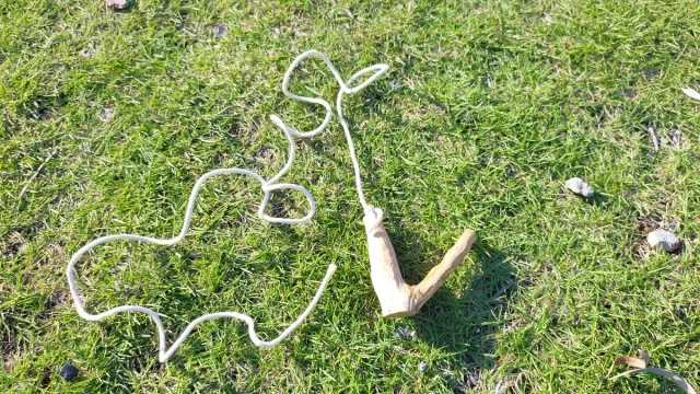 さきほど開けた穴にロープを通しましょう。ロープが抜けることがないように、ロープの先端を結んだら完成です。