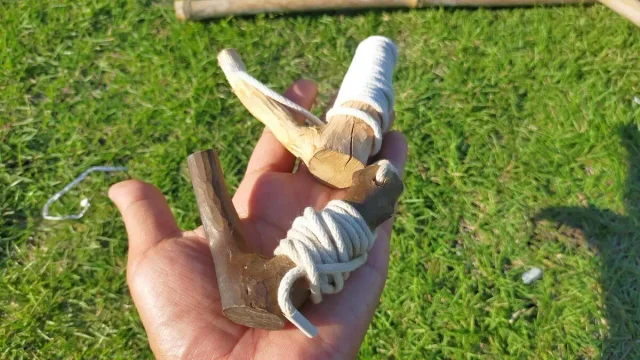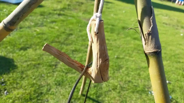 3本の竹にロープをぐるぐると巻き付けて結べば、そのままトライポッドと自在鉤として使用ができます。