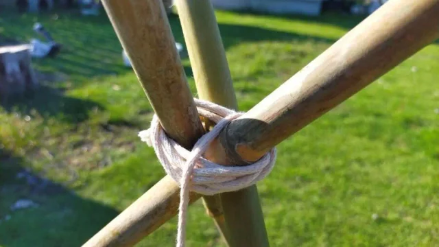 綿ロープの摩擦が働くので、3本の竹をがっちりと固定することができます。