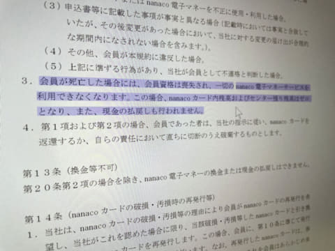 ただし、例外もあります。nanacoカードは利用規約で「会員が死亡した場合には、会員資格は喪失され、一切のnanaco電子マネーサービスを利用できなくなります。この場合、nanacoカード内残高およびセンター預り残高はゼロとなり、また、現金の払戻しも行われません」と明言しています(nanacoカード会員規約 第12条-3)。