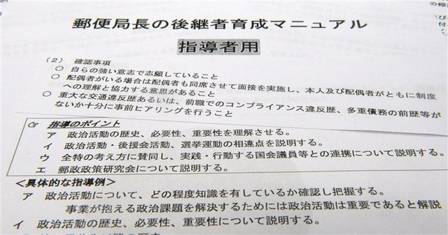 小規模郵便局の局長でつくる任意団体「全国郵便局長会」(全特)が、局長を志望する人に対して、日本郵便の採用試験の前に、配偶者も同席させて面接するなど独自に選考を行っていることが、内部資料で明らかになった。通過者には長期間に及ぶ研修を受けさせ、選挙活動の重要性などを理解させた上で採用試験を受験させるとしている。全特は、参院選に自民党から組織内候補を擁立しており、全特が局長の採用権限を実質的に握り、政治活動に利用している構図が改めて裏付けられた。