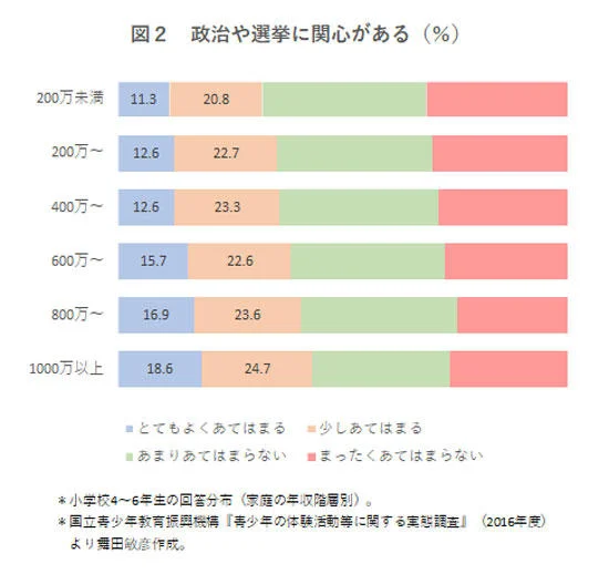 富裕層の子どもほど、政治や選挙への関心が高い傾向が見られる。家庭で政治について話す頻度の差などによるものだろう。これは小学生のデータだが、中学生や高校生になるにつれて、この格差が拡大するとしたら問題は深刻だ。公教育を担う学校は、家庭環境による格差を是正することにも注意を払う必要がある。