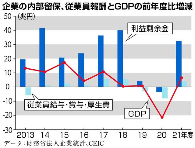 利益剰余金は資本金と同じく「株主資本」を構成するが、22年3月末では資本金の5・7倍で、10年前の2・8倍から大きく膨張している。元はといえば、米国流株主資本主義に傾倒した小泉純一郎政権時代の02年7月の会社法施行以来の傾向だ。