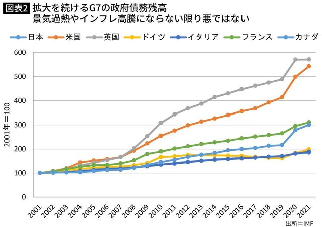 そのことは、過去20年間におけるG7諸国の政府債務残高の推移を見れば明らかである。