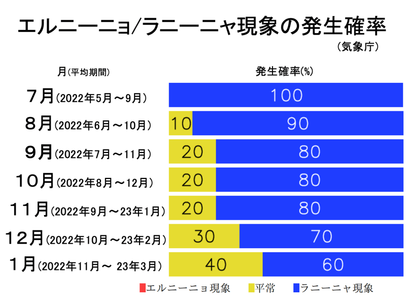秋にかけてはラニーニャ現象が継続する可能性が高く、厳しい残暑が長引く見込みです。冬の半ばまでラニーニャ現象が継続する確率は60%です。