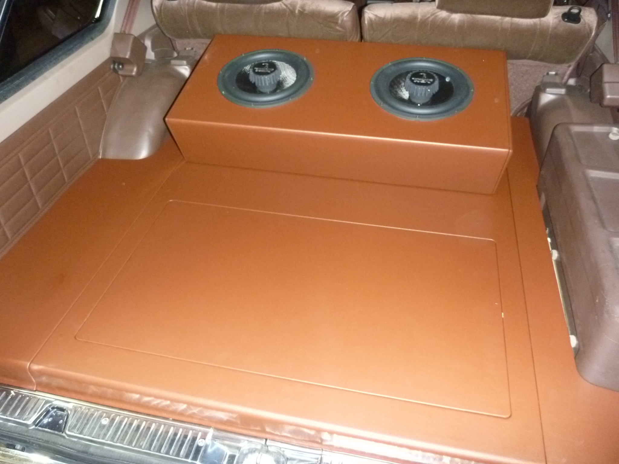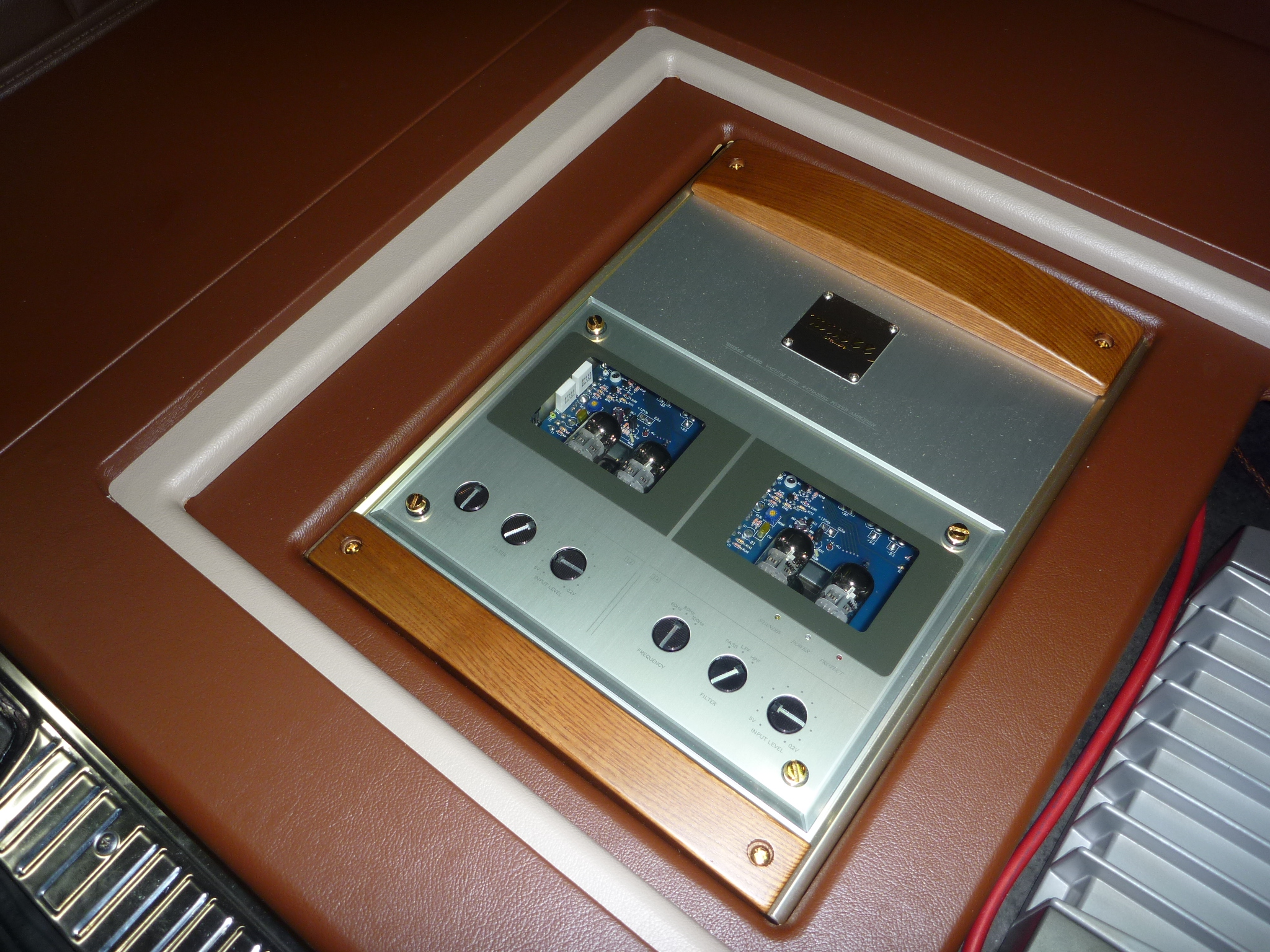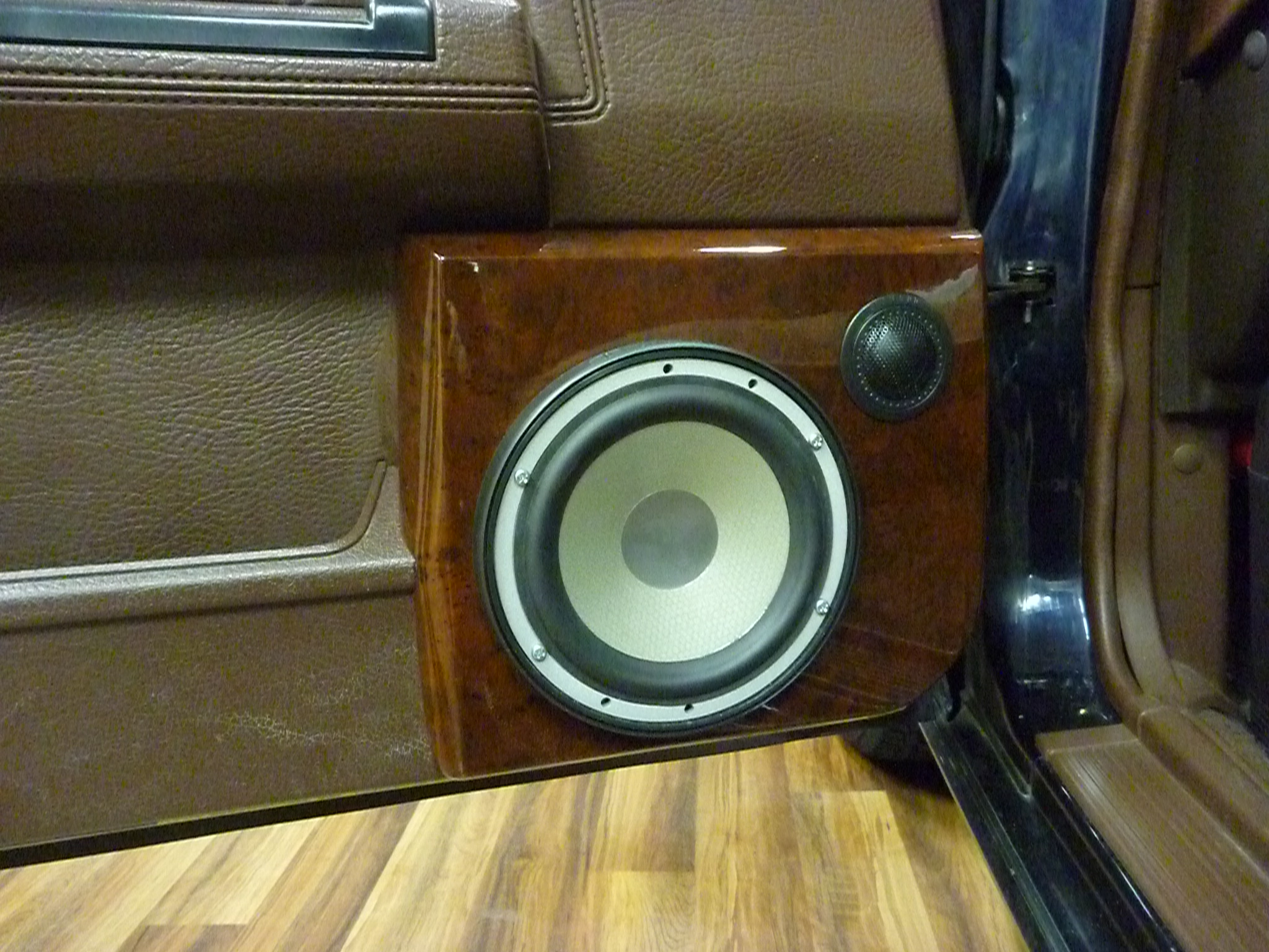 アウターバッフルは,クルマの内装のイメージと合わせて,スクエアーな感じのデザインにして,仕上げは内装パネルとあわせたウッド調に仕上げました。(美しい!)