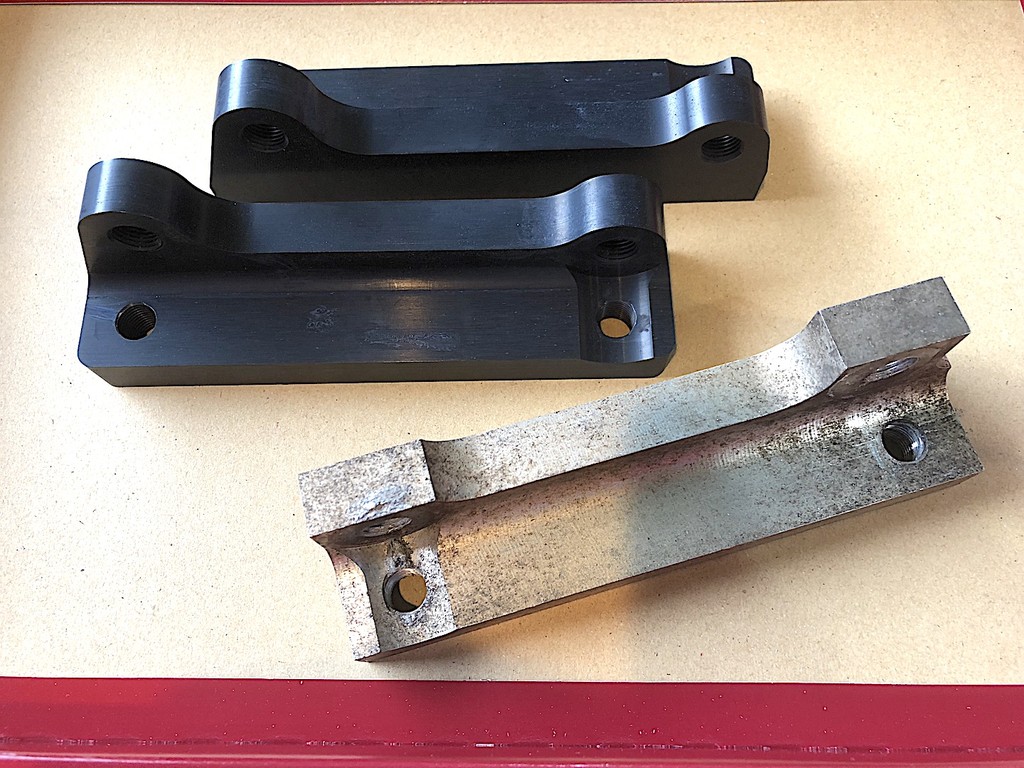 brembo?ブレーキ用ブラケットワンオフ製作 模造品ブレンボキットを装着のお客様より、ブラケットが折れてしまったので同じものを作って欲しいとのご依頼です。 この種の物は、やはり精度も素材も最低レベルで、腐食防止のアルマイトすらかかっていませんでした。 2個のうち1つは完全に2つに割れてしまっており、残りの1つもクラックが入りすぐ同じようになってしまいそうな状態です。 ここから寸法を拾っての製作になります。 元があまりにも格好悪いので、少しアレンジして見ました。 もちろんアルマイト処理も施して完成です。