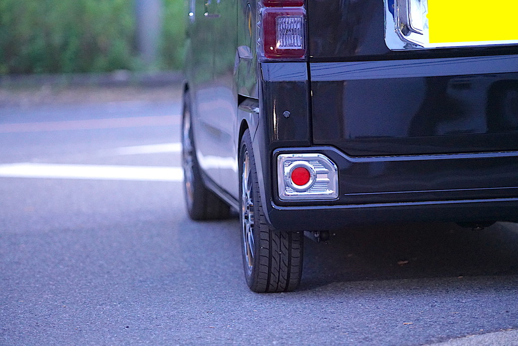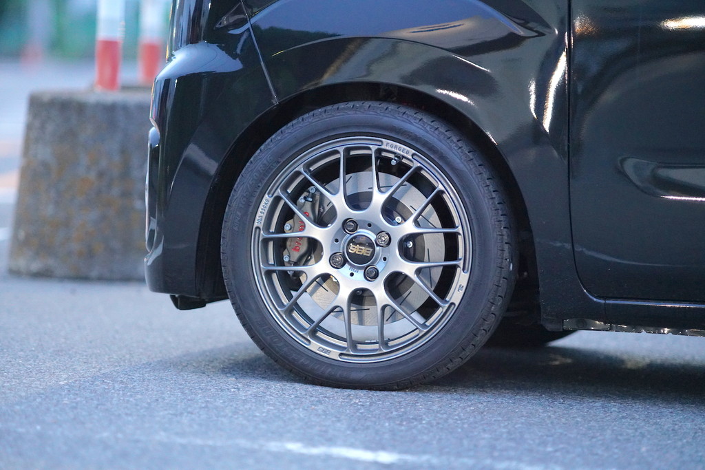 16インチホイール装着という事で、スペースは十分にありますが、汎用の軽自動車用ホイールの為、かなり内側にセットされていた為、ついでにスペーサーにてツライチ調整も行いました。
