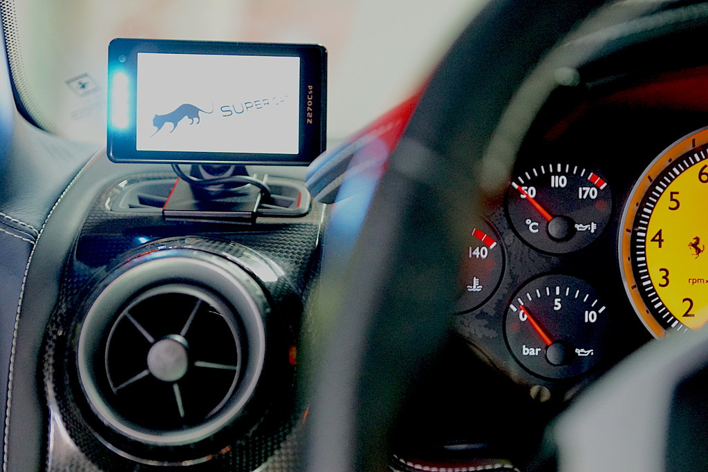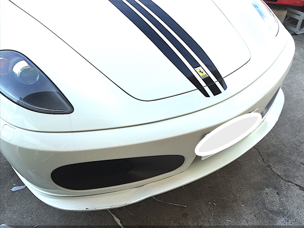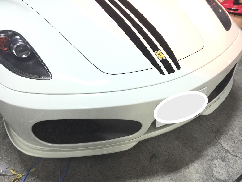 今回は、フェラーリの車検に合わせて、ユピテル販売店限定レーダー探知機の取り付け、バッテリ充電・メンテナンス用コネクター取り付け、欠品していた純正工具セットとパンク修理セットの装着、割れたリップスポイラーを取り外し、持ち込み品のハーマンリップスポイラーに交換作業です。