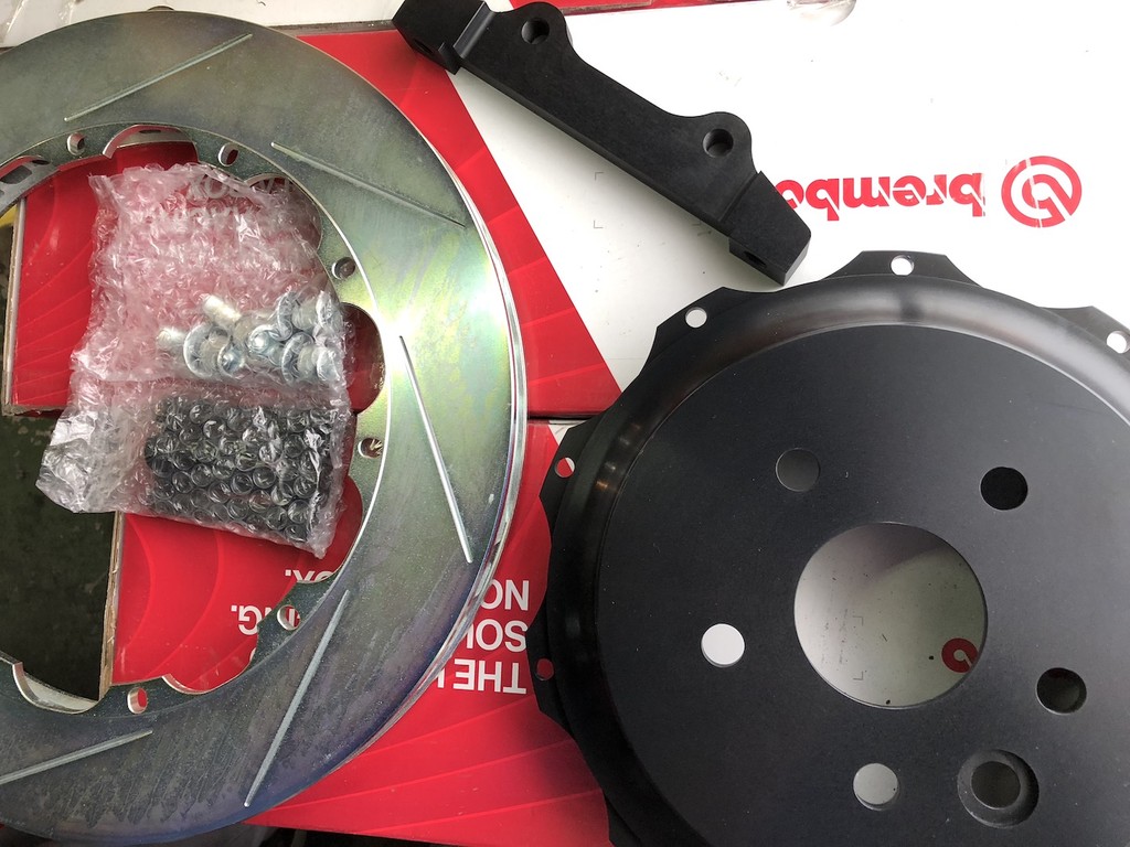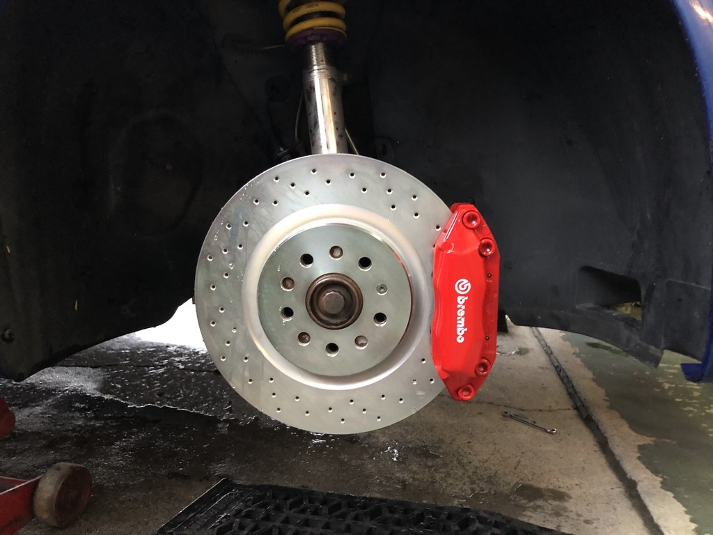 点検するとやはりディスクもパッドも交換時期を過ぎておりましたので、お客様とご相談し、新たにブレンボシステムを丸ごと新設する事になりました。