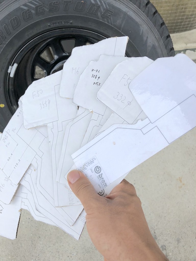 このようにして、実際のホイールに合わせてクリアランスを確認します。 どうやら、キャリパーとディスクサイズに検討がつけられそうです。 後は、実際にご入庫頂きワンオフ製作になります。