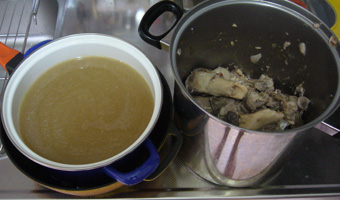 拳骨と背ガラを血抜きをして数分ボイルして下処理し、拳骨はハンマーで叩き割ってからコトコトとひたすら煮込むのみ。最後の1時間くらいだけスライスした生姜と白葱の青い部分を加えて煮込んだらさっさとろ過して冷却に入った。