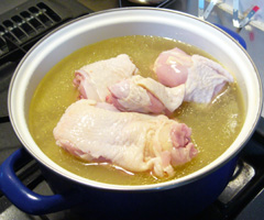 血抜きした鶏ぶつ切りを前日のスープに入れ、モミジと一緒に煮出していく。