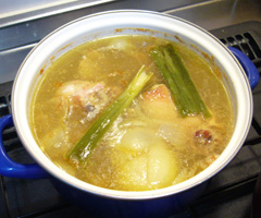 始めに鶏肉からアクが出なくなってきたら玉葱半分も一緒にいれ、1時間半後に白葱の青い部分も加えて煮出した。