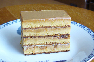 今回はビスキュイ生地にたっぷりとシロップを染み込ませたお陰で、生地はかなり柔らかく口溶けもよい。しかし、キャラメルシロップたっぷりでキャラメルクリームを生地に煉り込んだのが今ひとつ分かり難い感じ。くるみのカリカリ度は相変わらずでバタークリームは前ほどのこってりでも無い感じ。