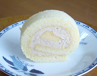 生地とプリンが出来たら、グラニュー糖を焦がしてカラメル上にし同量の40%生クリームを加えたカラメルクリームを入れたホイップクリームにゼラチン少量を合わせたものを生地に塗り、巻いた時に中心に来るように円柱状のプリンを乗せて巻いたら出来上がり。