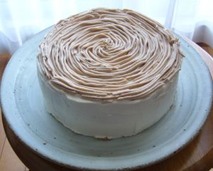 後は栗風味のホイップクリームを全体にナッペして、上にはマロンクリームをにょろにょろと円形に絞り出して完成。丸く絞ってはいるが、カットすると丁度横向きにマロンクリームが掛かっている状態となる。
