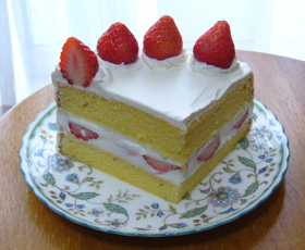 スポンジの間を切ってを2段にし、その間にホイップクリームを乗せて縦切りの苺をクリームに埋めて上にも苺を乗せて完成!
