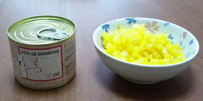 甘露煮を小さな賽の目状に刻んでマロンクリームの中に混ぜ込むのだ。
