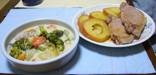 砂糖20gを軽く焦がし、バター10gを加えて1cm程度にスライスしたリンゴを絡めて水分を飛ばして、塩コショウした豚ロースにリンゴ蜂蜜ソースを絡めて焼いたら出来上がり。