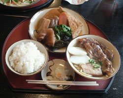 知り合いに教えて貰った定食屋で沖縄そばと煮込みの定食+ソーキを食す。