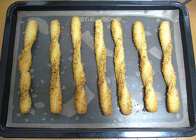 伸ばしたあと短冊状にカットし、アーモンドダイスが余っていたのでパイにダイスをまぶして3捻りを加えて天板に並べる。広がらないように端っこの部分は天板になすりつけるようにしておく。