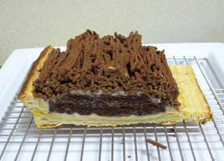 その上にホワイトチョコのガナッシュを塗って、チョコスポンジシートを重ねて上からホワイトチョコガナッシュを塗り固め、チョコモンブランの様にビターチョコガナッシュを絞り出して、上からココアの粉を振り掛けたら出来上がり。