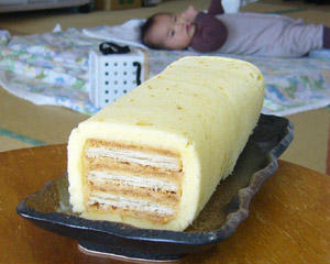 次に、卵2個を使って28×28cmの大きさでモスリンロール生地を焼き、適当配合で作ったキャラメルバタークリームをパイで挟み、周りにもクリームを塗ってロール生地を巻きつける。