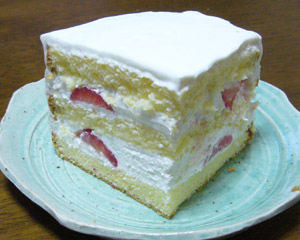 切る時に苺が現れないピースが何個かあり、切り口全てに苺を覗かせるには、かなり苺を敷き詰めないといけない事が分かった。