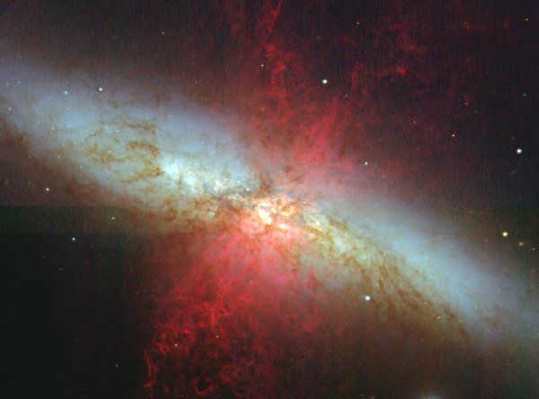 M82星雲は、地球から1200万光年離れた、おおぐま座にある銀河。中心部から極方向に向かって電離した水素ガスが吹き出している。