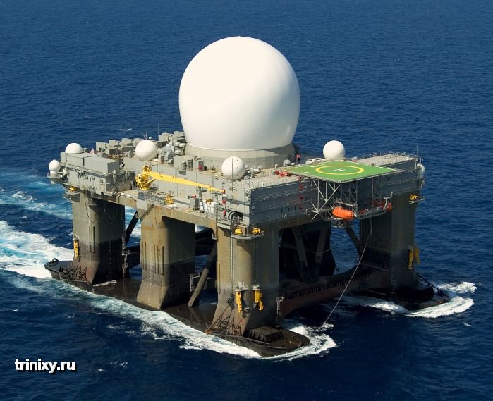 小型の弾道ミサイル弾頭を探知・追尾するために使用周波数はXバンド(7から12.5GHz)と高く、発信出力もメガワット級とかなり大きい。推定探知距離は5,000km。排水量は50,000tで、自走も可能なんだとか。