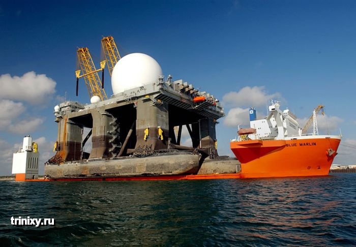 極東からの攻撃を警戒するために、アリューシャン列島のアダック島を母港とし、アラスカ近海の北部太平洋に配備される、石油プラットホームを基に、上部に大型レーダーを搭載したもので、こんな感じの外観をしているんだ。そのSBXが艀に搭載され輸送され、浮動している写真があったのでみてみることにしようそうしよう。