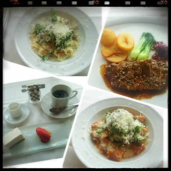 前菜、パン、パスタ、肉料理、デザート、コーヒー