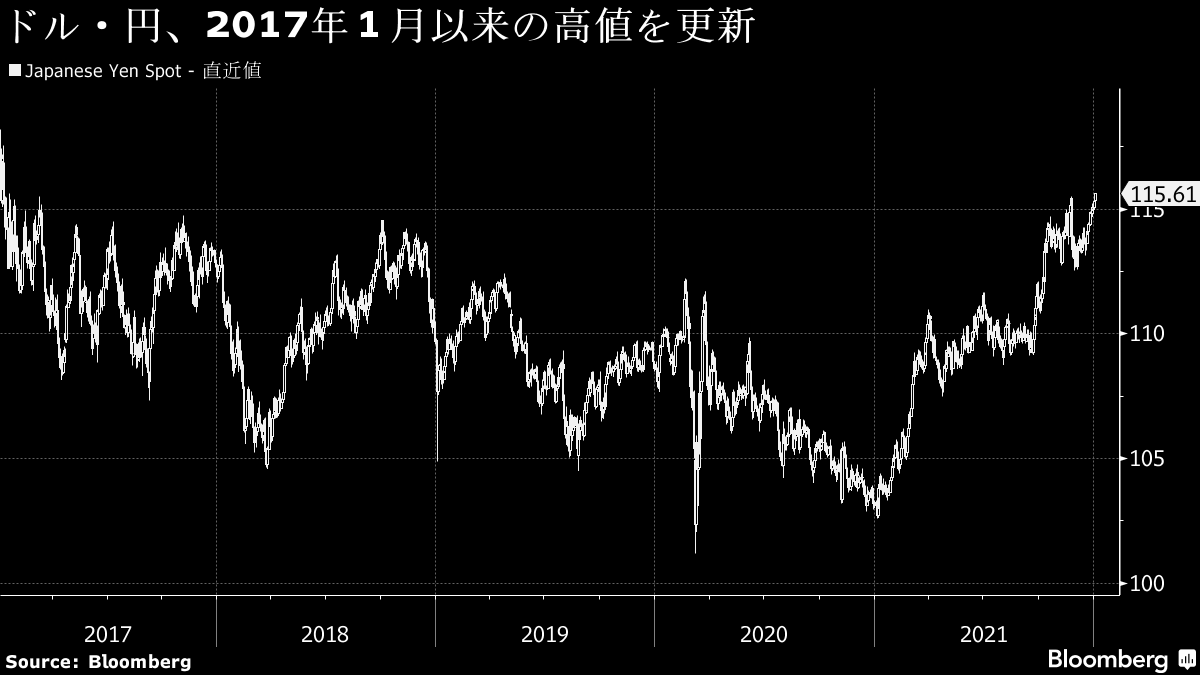 ドル・円、5年ぶり高値更新-米早期利上げ観測くすぶるなか買い先行東京外国為替市場のドル・円相場は買いが先行し、一時115円63銭と2017年1月以来の高値を付けた。米早期利上げ観測が高まる中、前日は米金利が全年限で大きく上昇するなど、ドルを押し上げる環境が整いつつあるとみられている。www.bloomberg.co.jp
