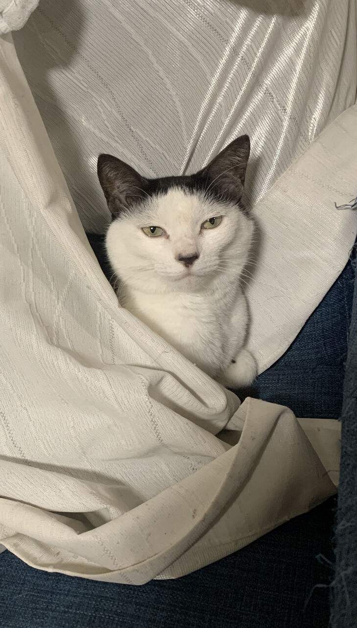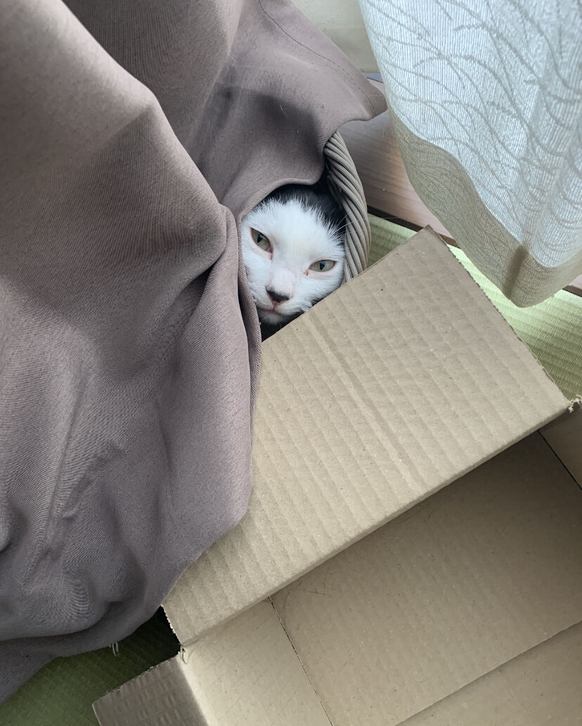 ↑カーテンの下からコンニチワ。妖怪感溢れるチータン。