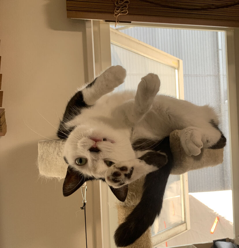 ↑キャットタワーでひっくり返って見せるお茶目なチータン。
