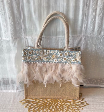 夏のさわやかコーデに!リゾート感いっぱい!インド刺繍リボンとふわふわフェザーのジュートバッグ