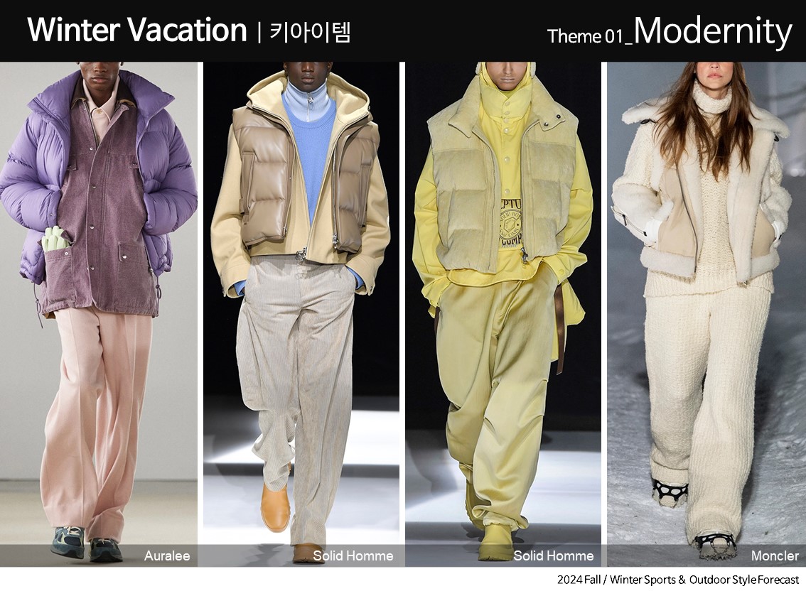 パディングベストと短い丈のパディングパーカは、重たいパディングの弱点を補うと同時に、カラースタイリング用に利用されます。丈が短いため、新しいプロポーションプレイやカラーブロッキング効果で楽しさを加えることができます。柔らかな外観からシアリング、織物素材の適用に至るまで、表面感で微妙な変化を引き出します。パステルトーン、ベージュ、アイボリーが主に軽いカラースキームに適用されます。