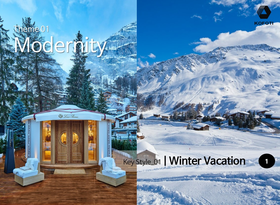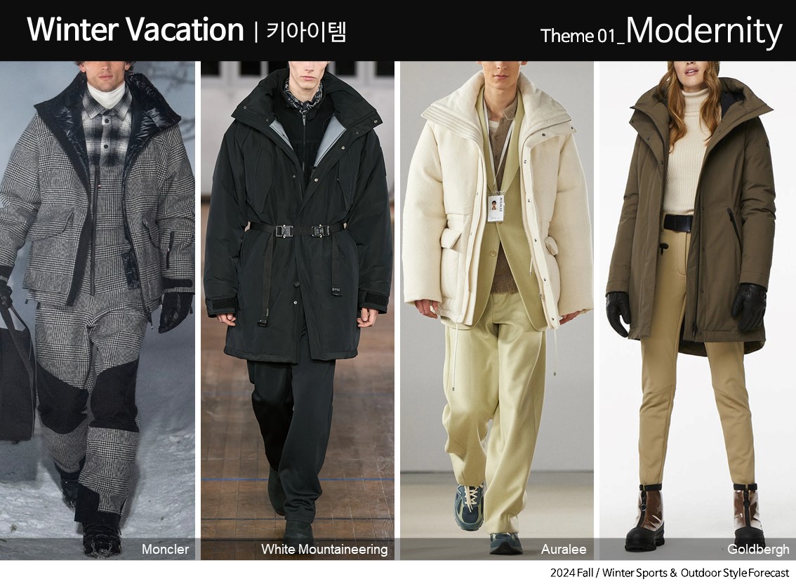 暖かく、日常着と自然にマッチするダウンパーカは、ブラック、グレー、アイボリー、カーキブラウンなど、どんなアイテムともマッチしやすい万能な色が適用されます。スポーティさを強調するよりも、モダンさを強調して利便性を高めます。伝統的なチェックをスキースーツに適用することで、日常着をスキーウェアに取り入れるスタイルを提案し、ハイブリッド感を逆利用して新しさを提供することができます。