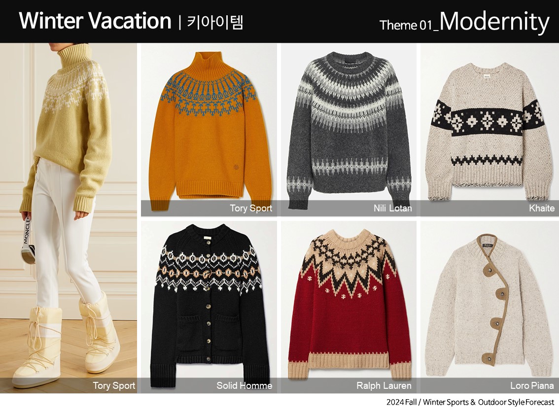 スキーウェアに合わせたニットは、雪に覆われた山小屋やキャビンの雰囲気を出すことができるノルディックパターンが強調され、典型的なパターンではなく、幾何学的に変形して若々しいムードを注入します。素朴な感じよりも、シンプルで軽快に適用され、トレンドを反映してクロップドバージョンも提案されます。シンプルな平織りのカーディガンは、レザーパイピングで冬休みのムードを加えます。