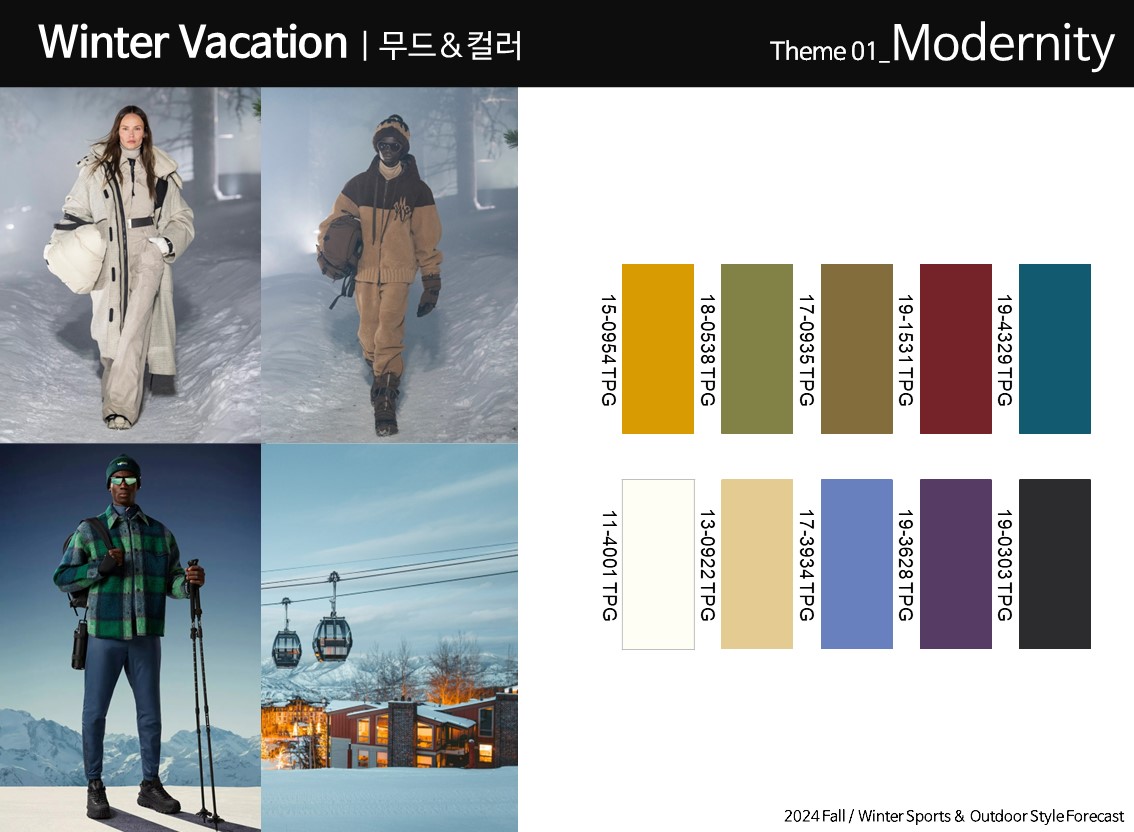 寒くなった冬の天気を考慮して、スキーやスノーボード用だけでなく、都市での通勤用にも使用される保温用アウターが増えています。レジャータイムと日常という二重のムードを捉え、これらのピースは、多様な素材とプリントパターンでよりファッショナブルになります。黒、白、ベージュといった従来から好まれていた基本色に、アウトドアのニュアンスのアーストーン、アクセントとして使用可能なイエロー、ワインレッド、パープル、スカイブルーが提案されます。