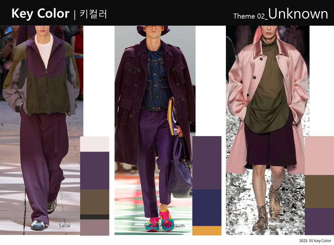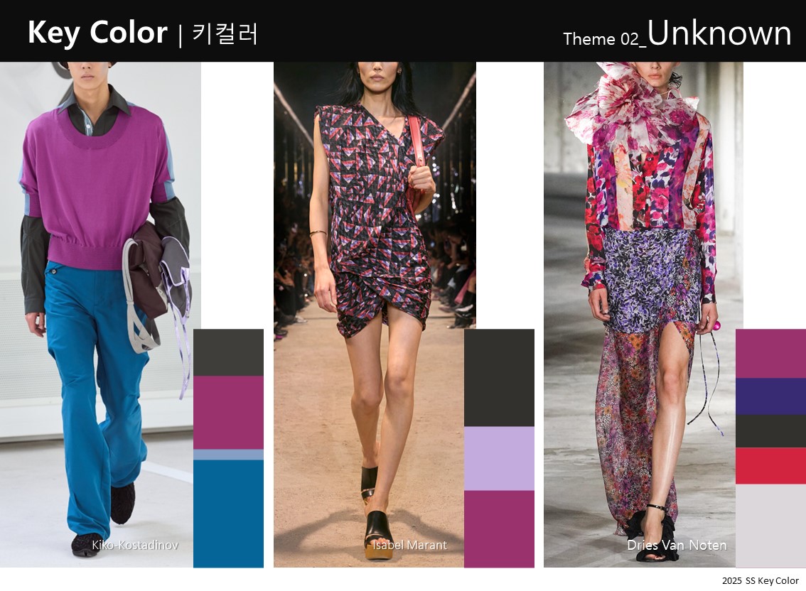 華やかで鮮やかな紫色は、暑く見えないように涼しげな印象で合わせます。ダークグレーを使って色の強さを抑え、隣接する色であるブルーやコーラルでブロッキング効果を出したり、類似色であるパープルやパステルラベンダーと一緒に使ったりします。