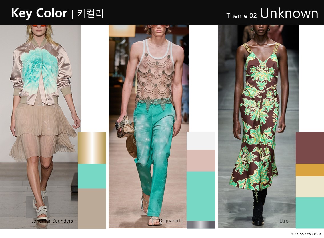 アイシーミントグリーンは、ベージュやブラウンと組み合わせて、無難さよりも独特さを強調します。類似色を使うとウェアラブルになりますが、ミントグリーンの清涼感を示すのは難しいです。ベージュと合わせることで、冷たく涼しい印象を強調できます。大胆に広い面積で使用することも、色の力を強調する方法です。