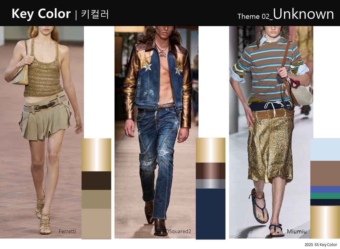 ゴールドは、過度にギラギラしたり、あまりにも黄色っぽい感じよりも、もう少し涼しい感じにする方が良いです。ブラウンやベージュと組み合わせて、あまり派手に見えないように使用します。ブルーやグリーン系と一緒に使うと、よりカジュアルに活用できます。