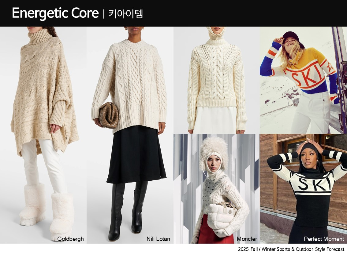 スキーブックやアウトドアウェアにもスタイリッシュな感覚が取り入れられ、クリエイティブディレクターのタッチが加えられた洗練されたシルエットが特徴。冬服は機能性のために重たく見えがちだが、ファンデーションウェア、ニットレギンス、ボディースーツ、ミニスカートを使用し、暖かく滑らかなボディラインを演出。ボリュームとフィット感のバランスが重要なポイントとなる。