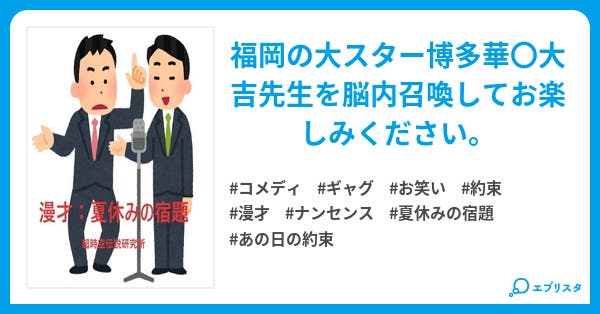 小学生の頃の約束をいま果たせと迫る相方。 夏休みの自由課題? 読書感想文? そういう宿題ありましたねえ。 昔の約束。破られた方はいつまでも覚えているもんですね。 演者には福岡の大スター、あのベテランコンビを脳内召喚してお楽しみください。